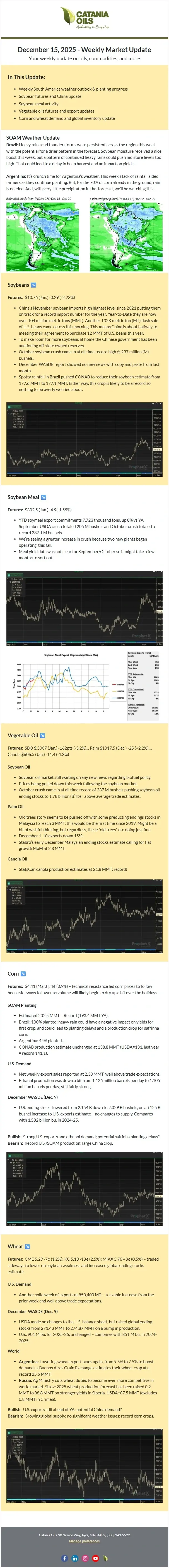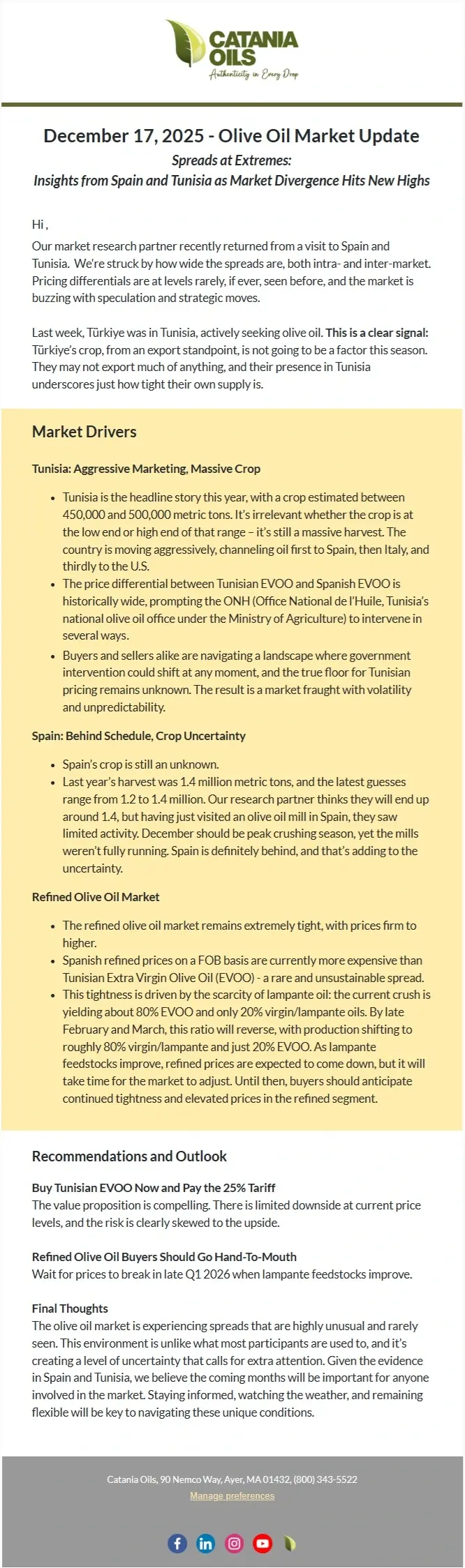 Today’s edible oils and commodities landscape can be volatile. Catania Oils’ weekly and monthly market updates give you real-time visibility into the forces shaping supply, demand, and pricing across North America and global markets.